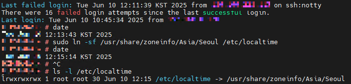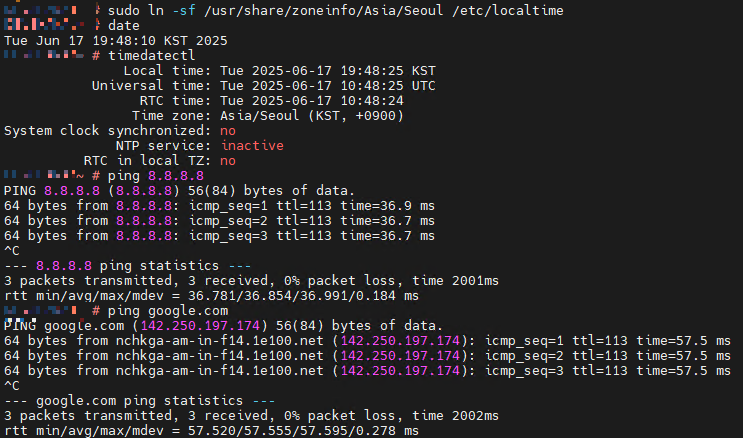 sudo ln -sf /usr/share/zoneinfo/Asia/Seoul /etc/localtime