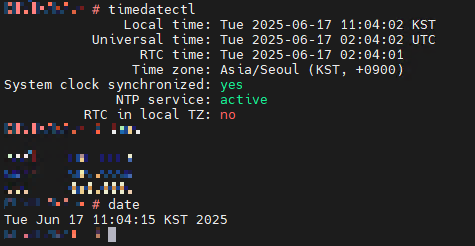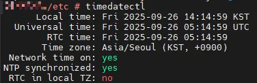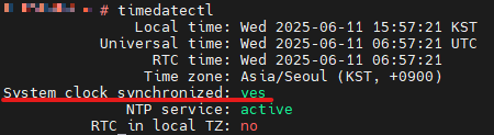 시간 지나면 NTP synchronized: no → yes 로 바뀜!