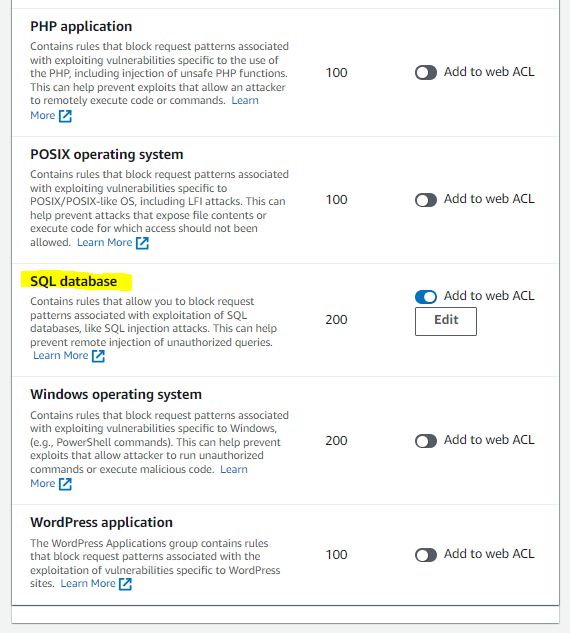 그 중에서도 AWS managed rule groups를 선택하면 Paid rule groups(유료)와 Free rule groups(무료) 그룹들이 존재함