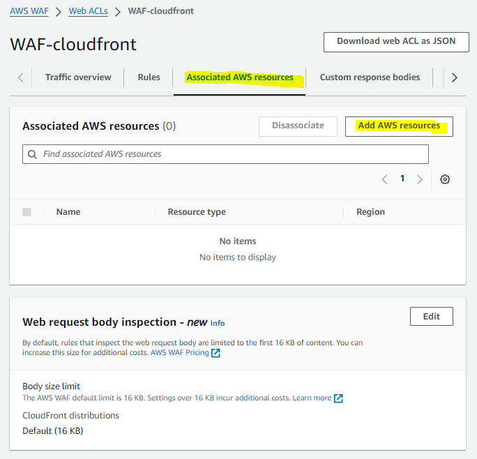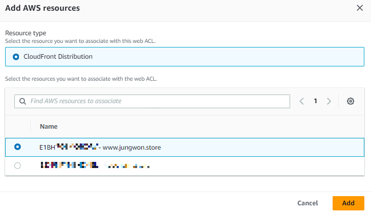 방금 생성한 Web ACLs > Associated AWS resources > Add AWS resources 클릭