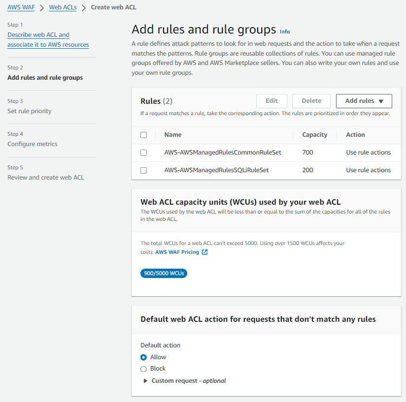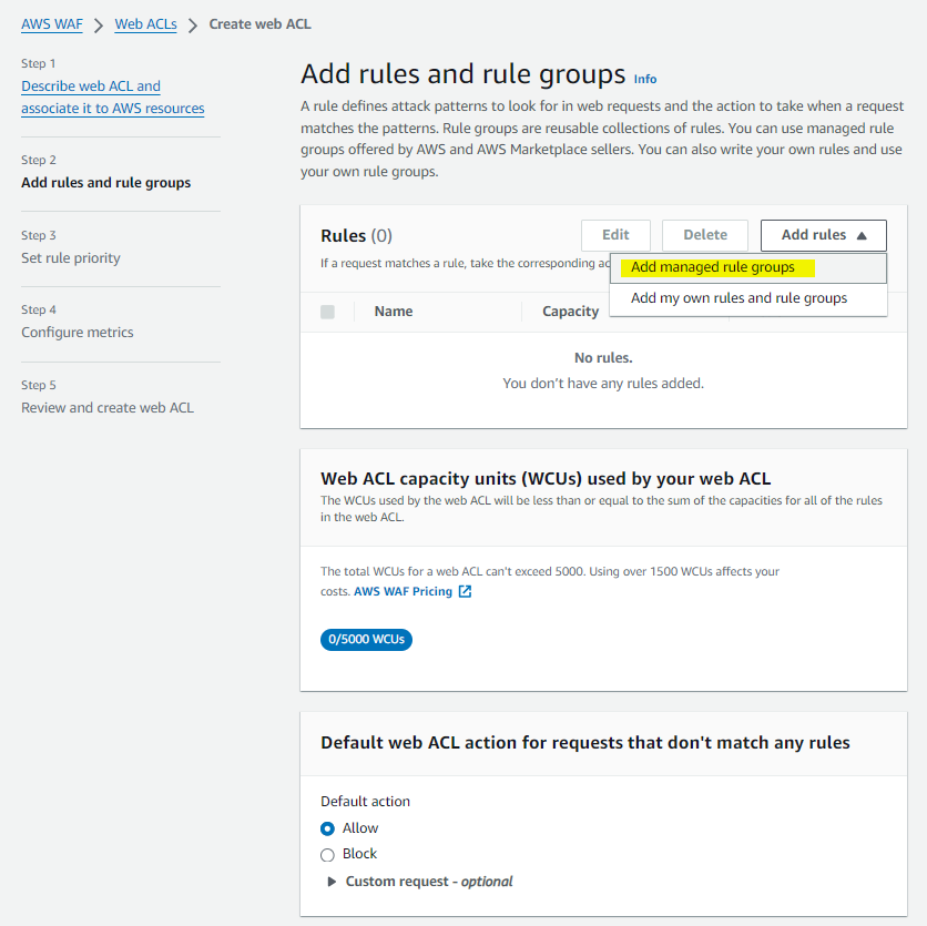 Add rules and rule groups > Add rules > Add managed rule groups 선택