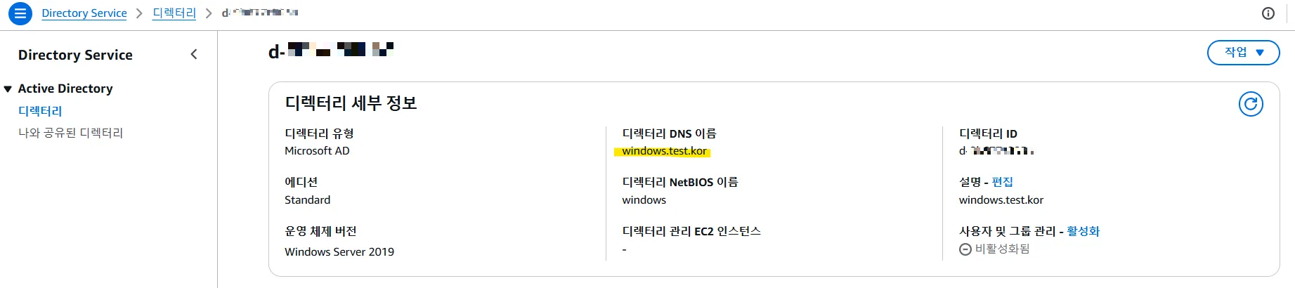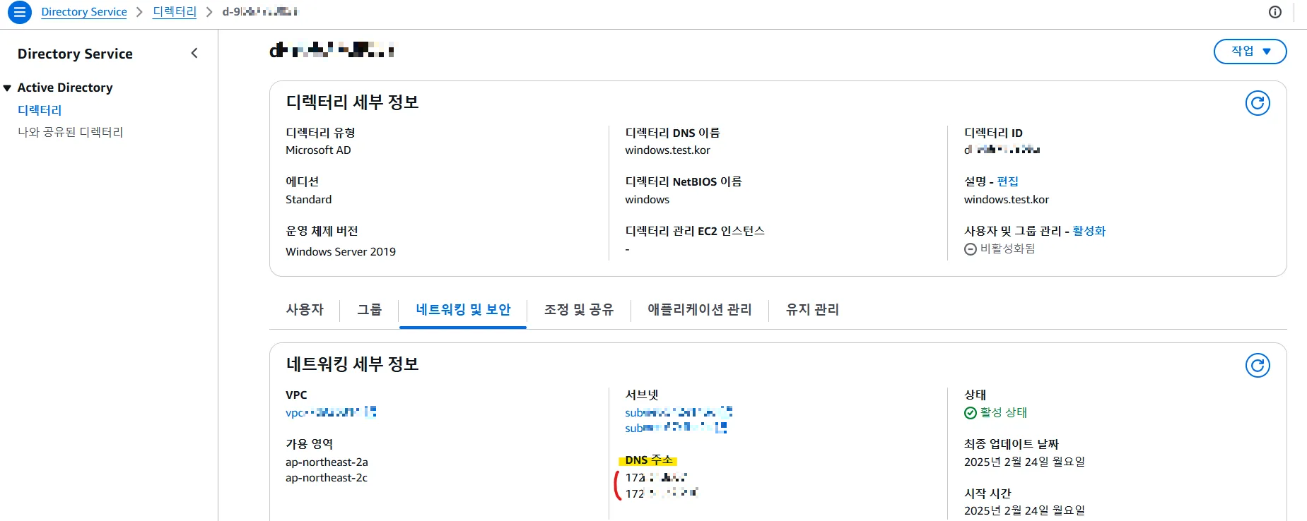 Directory Service > 디렉터리 > 해당 디렉터리 선택 > 네트워킹 및 보안 > DNS 주소 확인