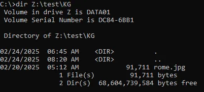 이제 Windows 파일 탐색기나 명령 프롬프트에서 Z: 드라이브를 열어 FSx 파일 시스템에 저장된 파일들에 접근할 수 있음