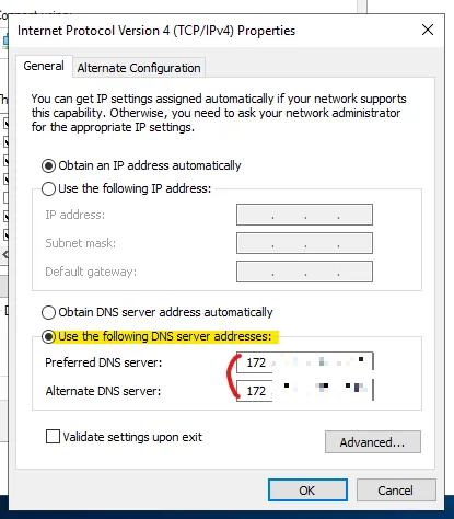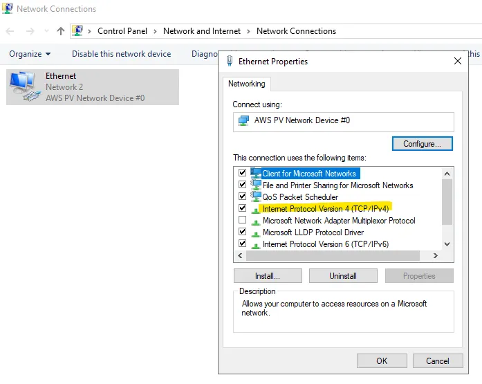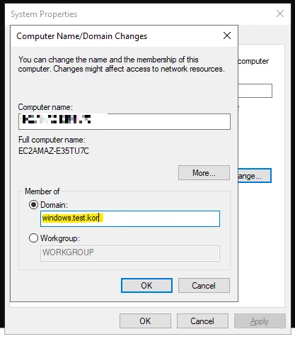 우클릭 > properties > Internet Protocol Version 4 > DNS 정보 수정(AWS Directory의 DNS 주소 참고)