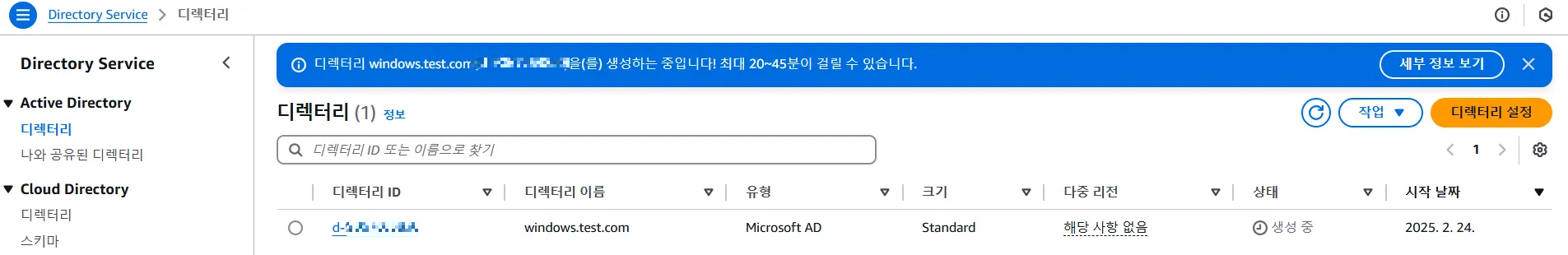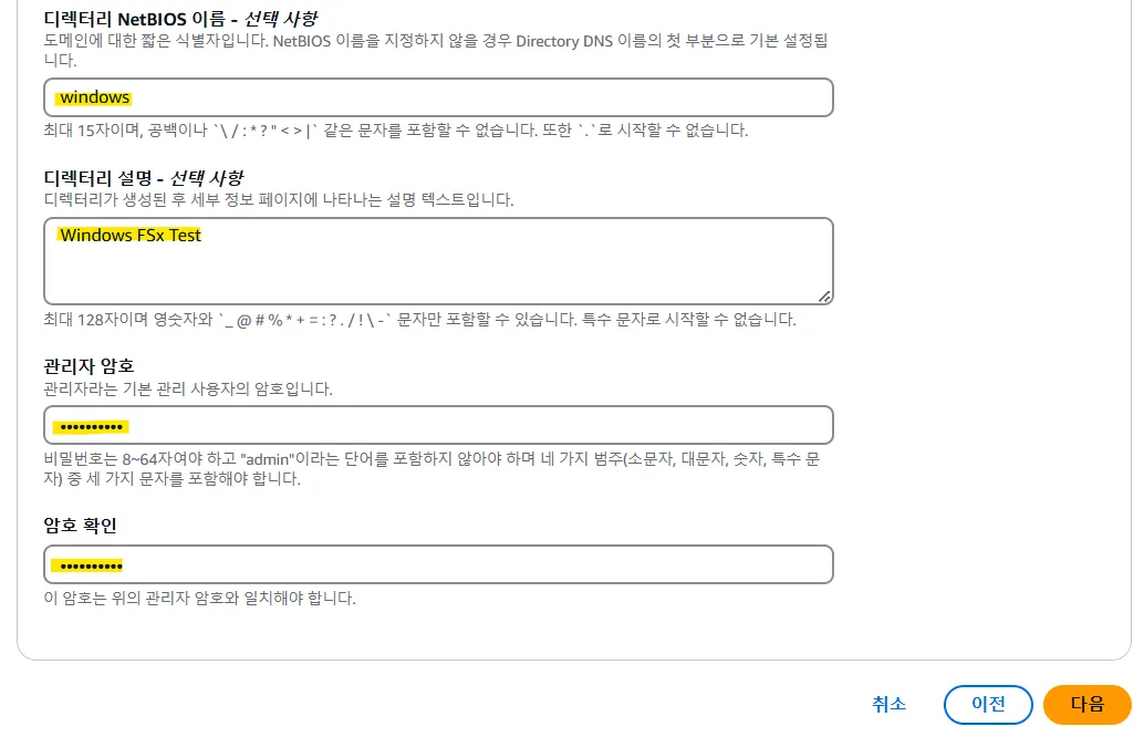 0. AWS FSx for Windows File Server를 생성할 때에는 AWS Directory Service에서 AWS Directory를 만들어야 함