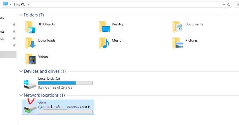 지정한 파일 공유가 성공적으로 연결되었으며, 이 연결은 Windows 네트워크 상에서 인식되고 있는 지 확인