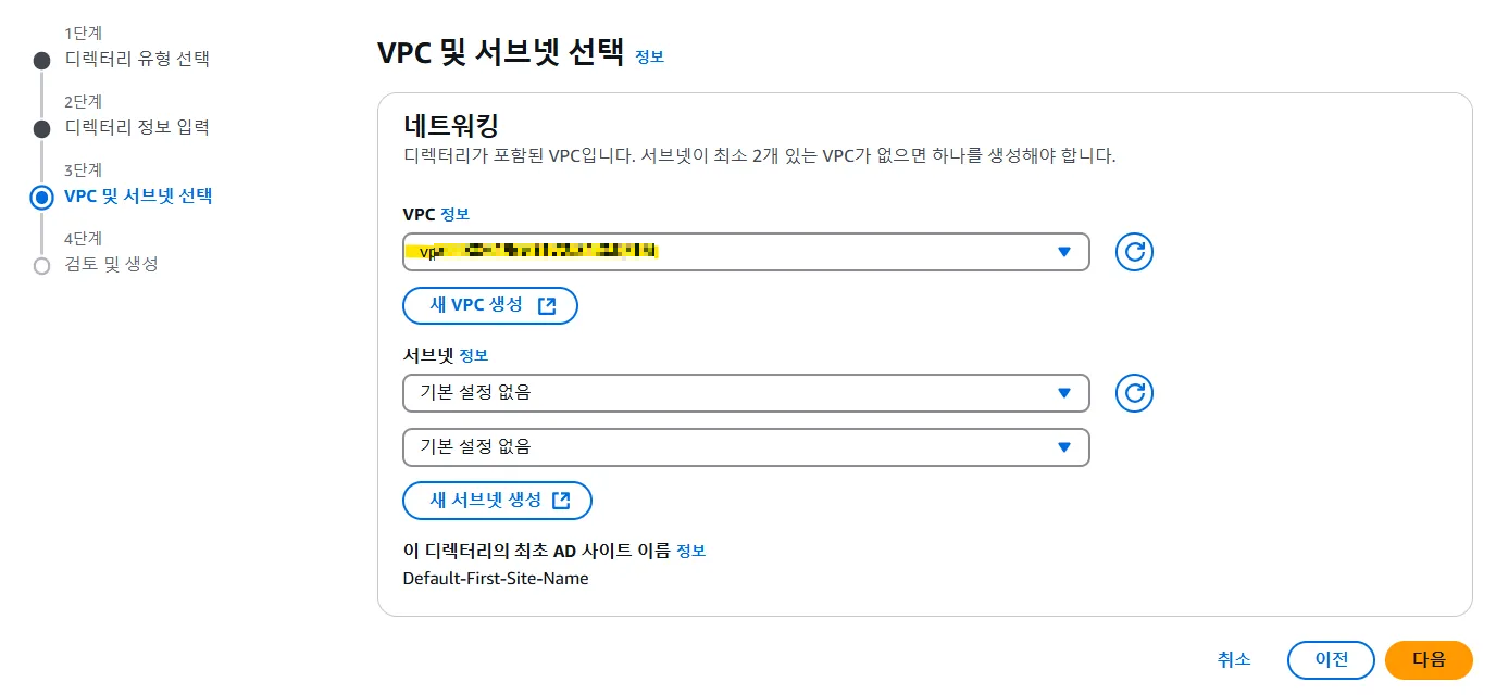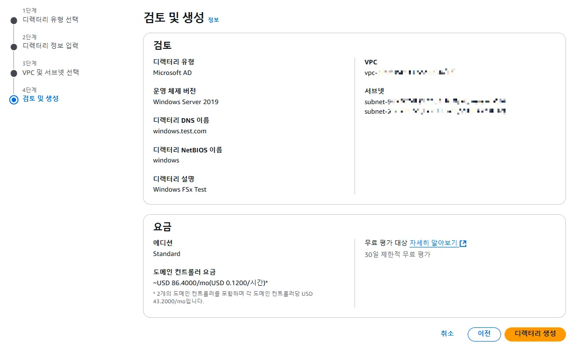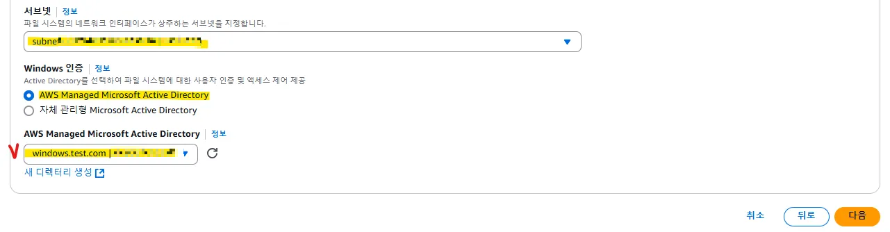 2-2. 빠른 생성 > 이름 입력 및 유형 선택 > SSD 스토리지 용량 > VPC 설정 > 서브넷 선택 > Windows 인증 > AWS Directory 선택