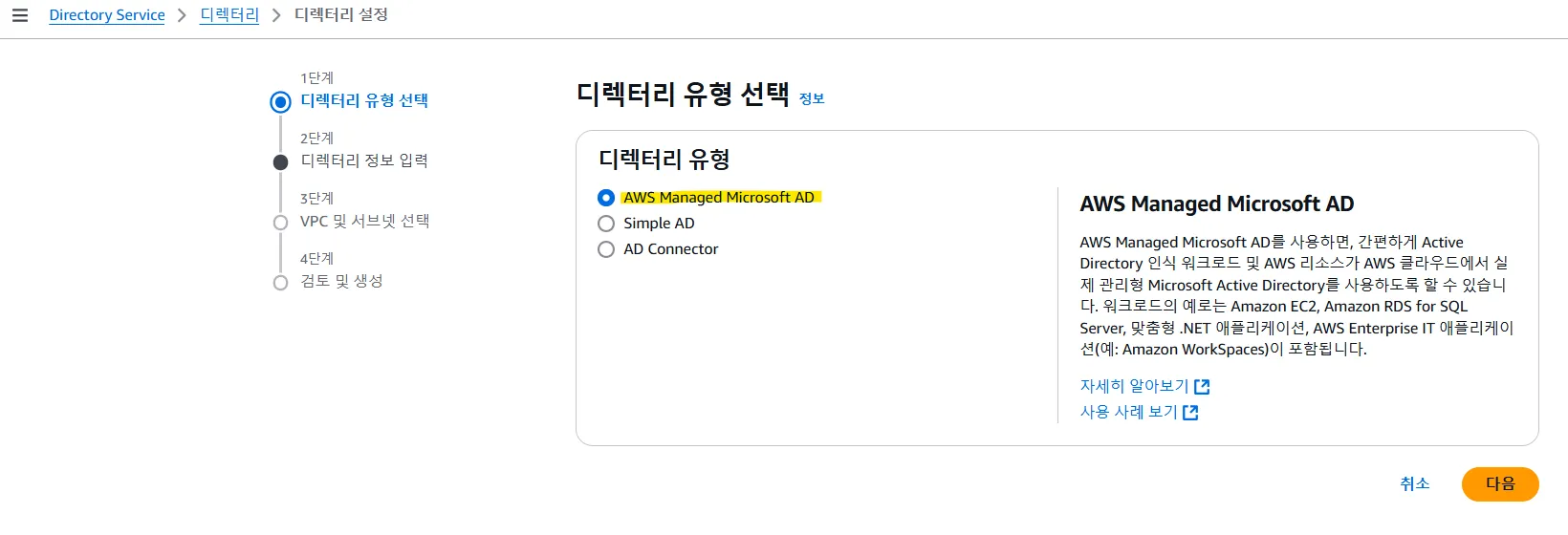 AWS Managed Microsoft AD: 완전 관리형 서비스로, 별도의 AD 인프라를 구축하거나 유지보수할 필요 없이, AWS 내에서 강력한 AD 기능과 보안을 제공