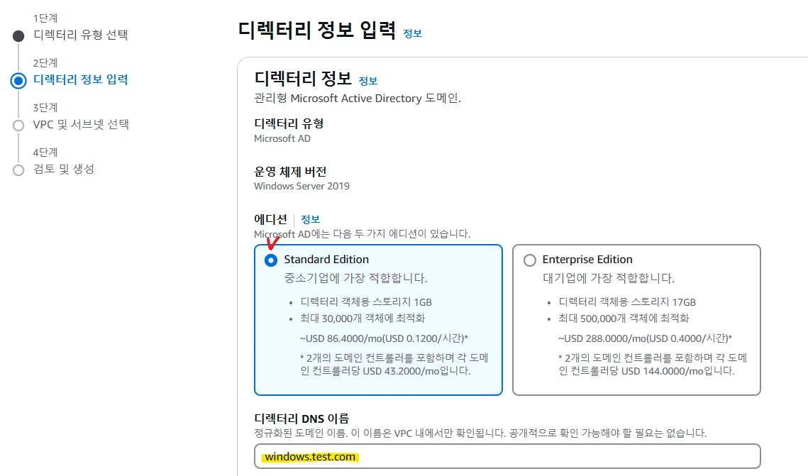 1-2. Standard Edition 선택 > 디렉터리 DNS 이름 입력