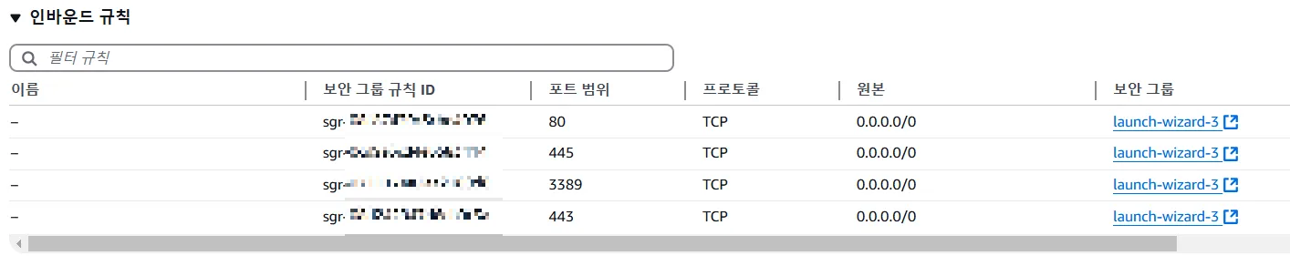SG: SSH / HTTP / HTTPS / SMB(windows 환경이라서)