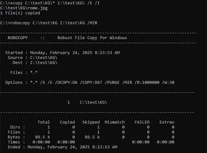 xcopy C:\test\KG\* Z:\test\KG\ /E /I