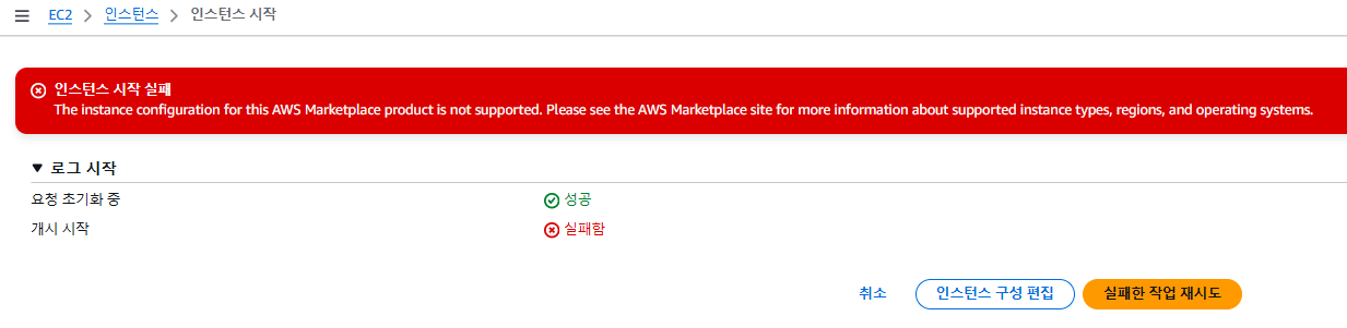 3. 인스턴스 시작 실패 문구가 계속 떴다. ' The instance configuration for this AWS Marketplace product is not supported. Please see the AWS Marketplace site for more information about supported instance types, regions, and operating systems.'